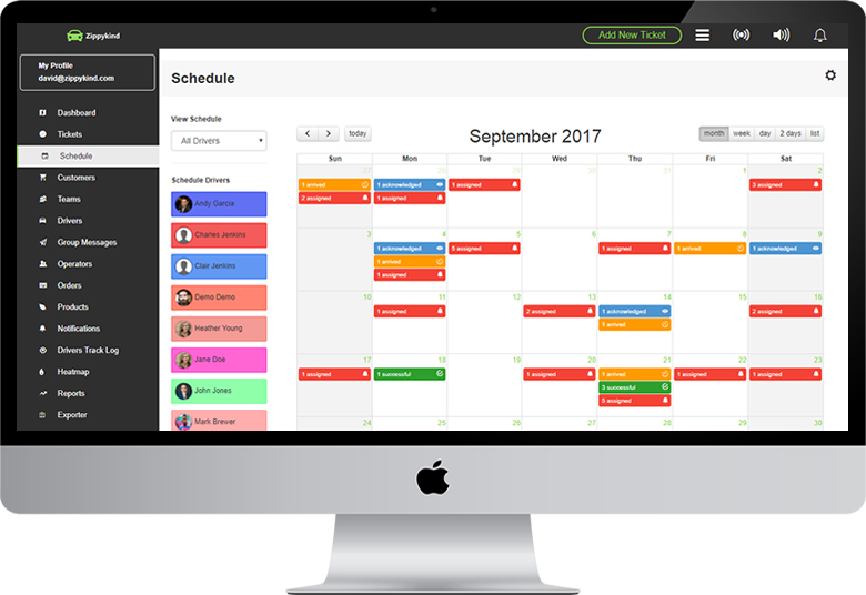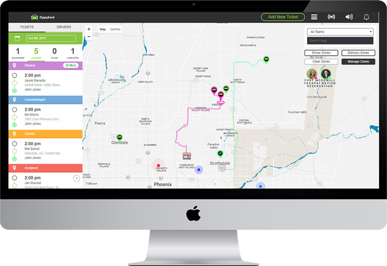 Through our dashboard page you will be able to see all of your delivery tickets color coded to be the same color as the driver they are assigned to. You can toggle between the delivery tickets column and the driver’s column to easily see the status of your tickets or the ticket list assigned to your drivers.- Real time tracking of your drivers.