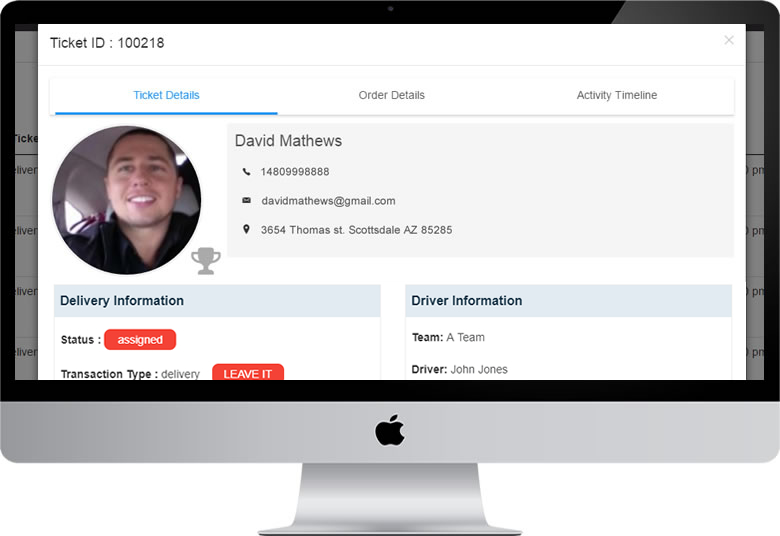You can easily toggle between: "Ticket Details", "Order Details" and "Activity Timeline" to get a detailed look at the delivery ticket.
