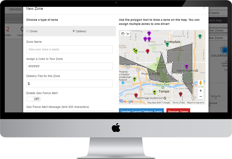 Our delivery map zones feature automates the entire delivery ticket creation process. Each time you enter a delivery address into a new ticket, if the delivery address is within a delivery zone, the rules of that zone will be applied to the ticket. There are 3 main ways delivery zones can be used:- Auto-assign your driver to a delivery ticket if the delivery address is within the driver's zone. Using this option you can assign your drivers to delivery territories.